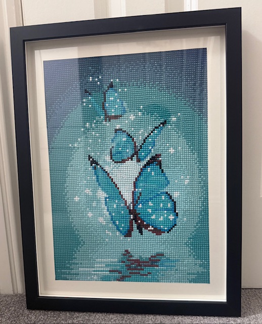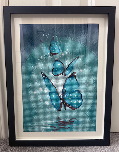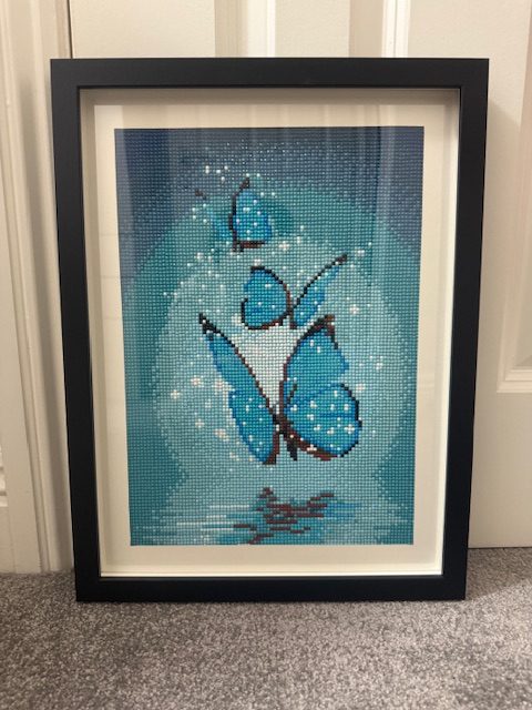 The price reflects the 30×40 cm size, the detailed hand‑placed resin drills and the framing. This handmade diamond painting of three blue butterflies is a unique, one‑of‑a‑kind piece, fully finished and ready to hang. Each artwork is crafted with precision to ensure long‑lasting sparkle, durability and a premium decorative finish.