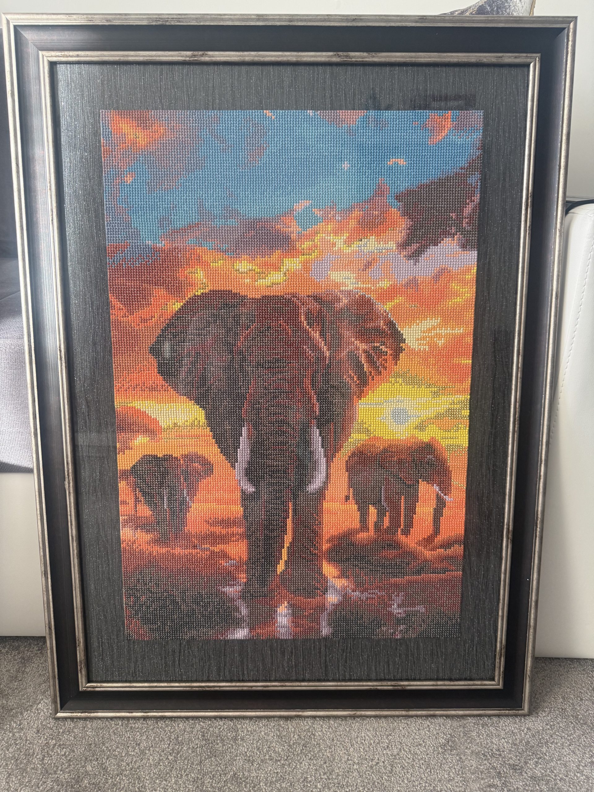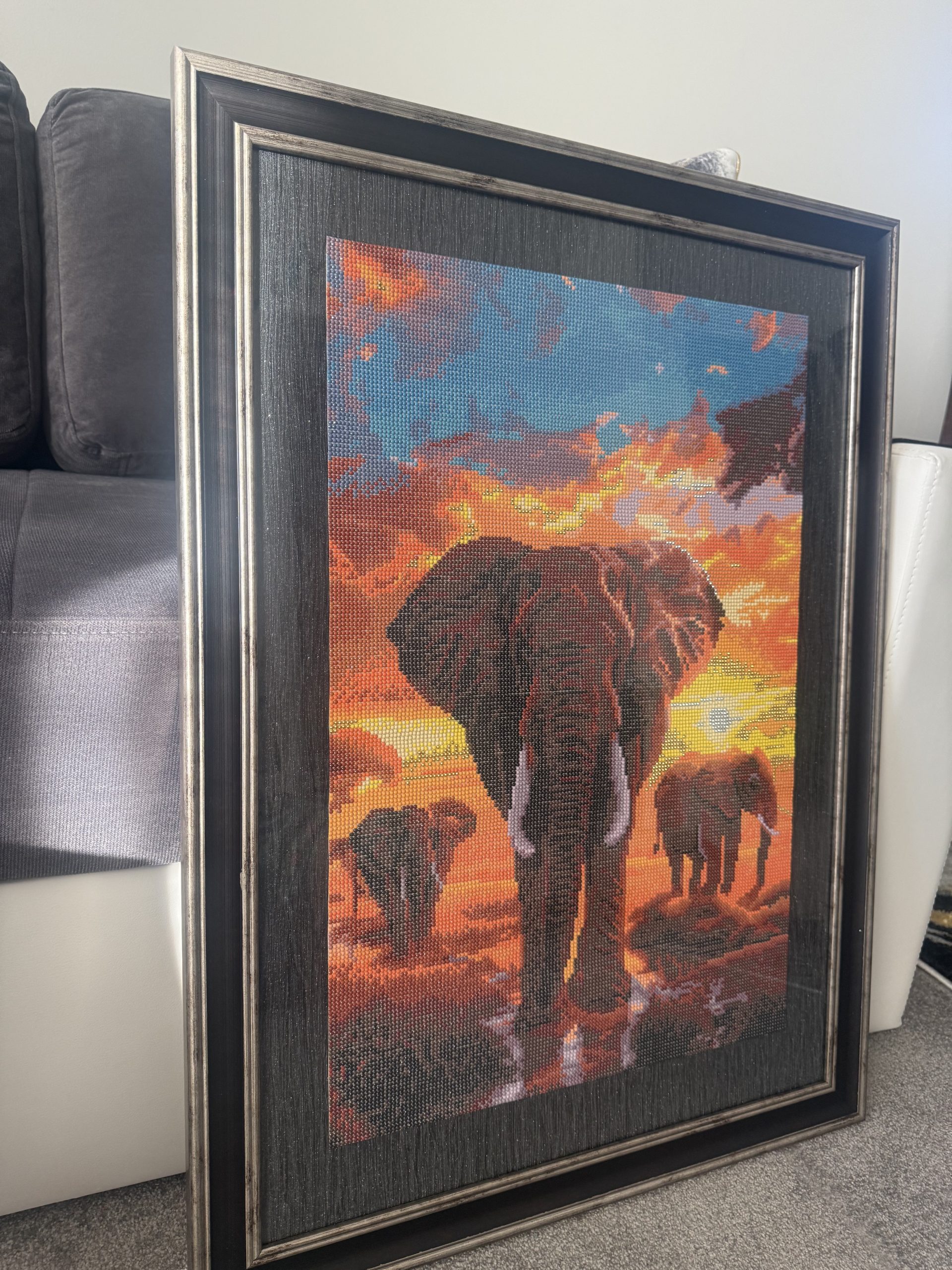The price reflects the large 50×70 cm format, the many hours of precise, hand‑placed resin drills and the quality framing. This handmade diamond painting features a vivid African sunset with a family of elephants, rendered in rich colours and sparkling detail. Fully completed and ready to hang, it offers a premium decorative finish and a powerful artistic statement for any interior.