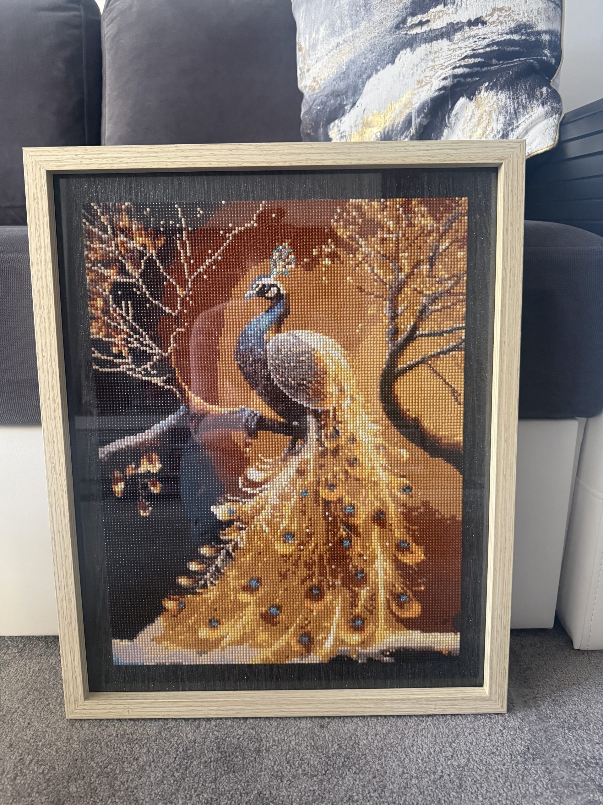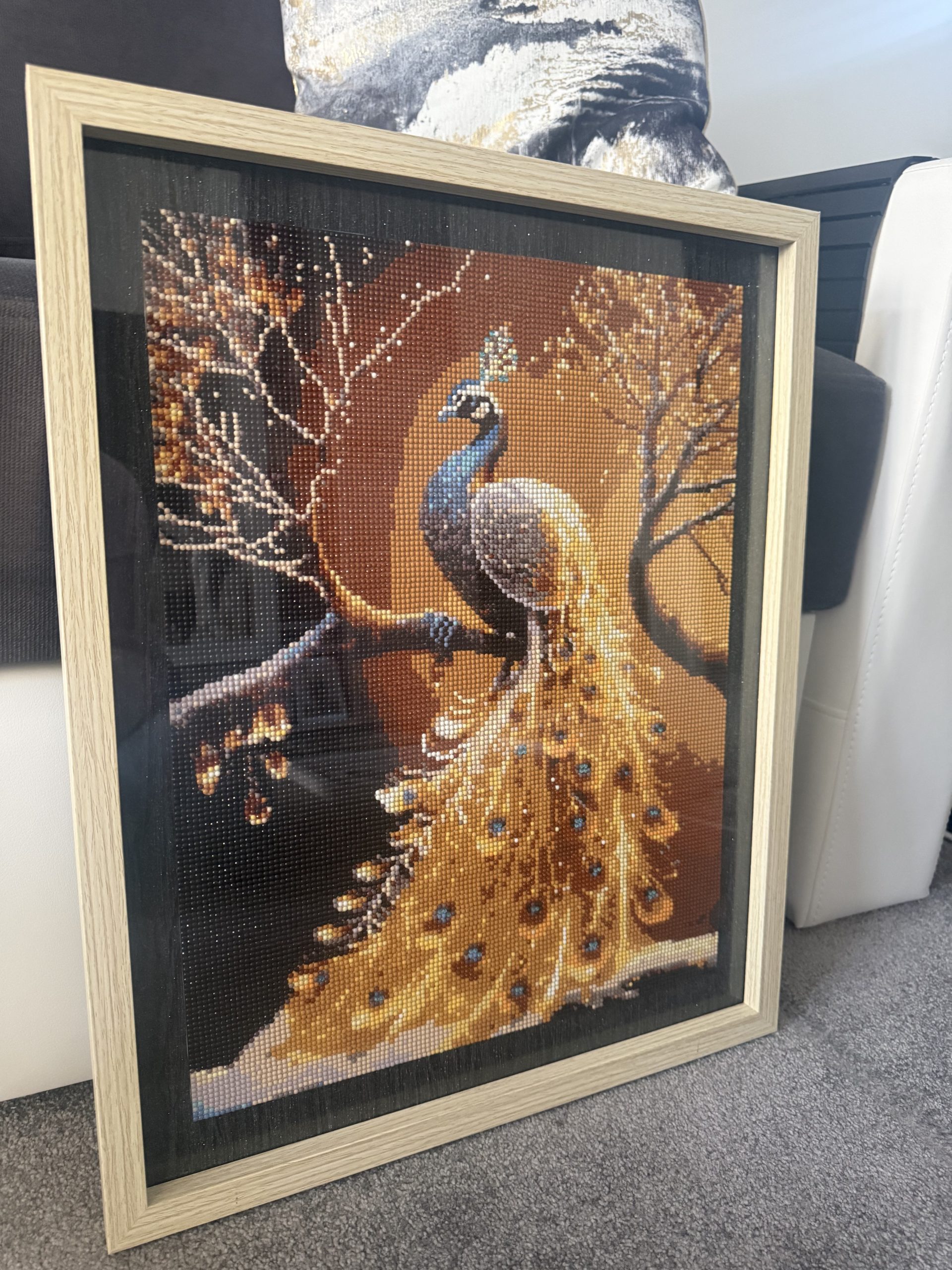 The price reflects the 40×50 cm format, the many hours of precise, hand‑placed resin drills and the quality framing. This handmade peacock diamond painting is a one‑of‑a‑kind decorative piece, fully completed and ready to hang. With rich colours, intricate feather detail and sparkling texture, it offers a premium finish and a striking focal point for any interior.