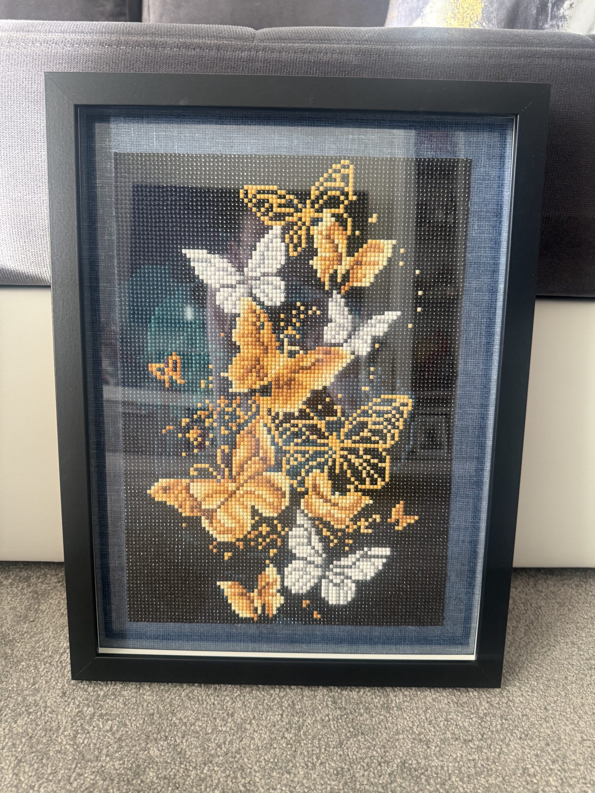 The price reflects the many hours of precise, hand‑placed resin drills and the high‑quality framing. This handmade diamond painting features golden and orange butterflies set against a deep background, creating a striking contrast and a luxurious visual effect. Fully completed and ready to hang, it offers lasting sparkle, refined craftsmanship and a premium decorative finish suitable for any interior.