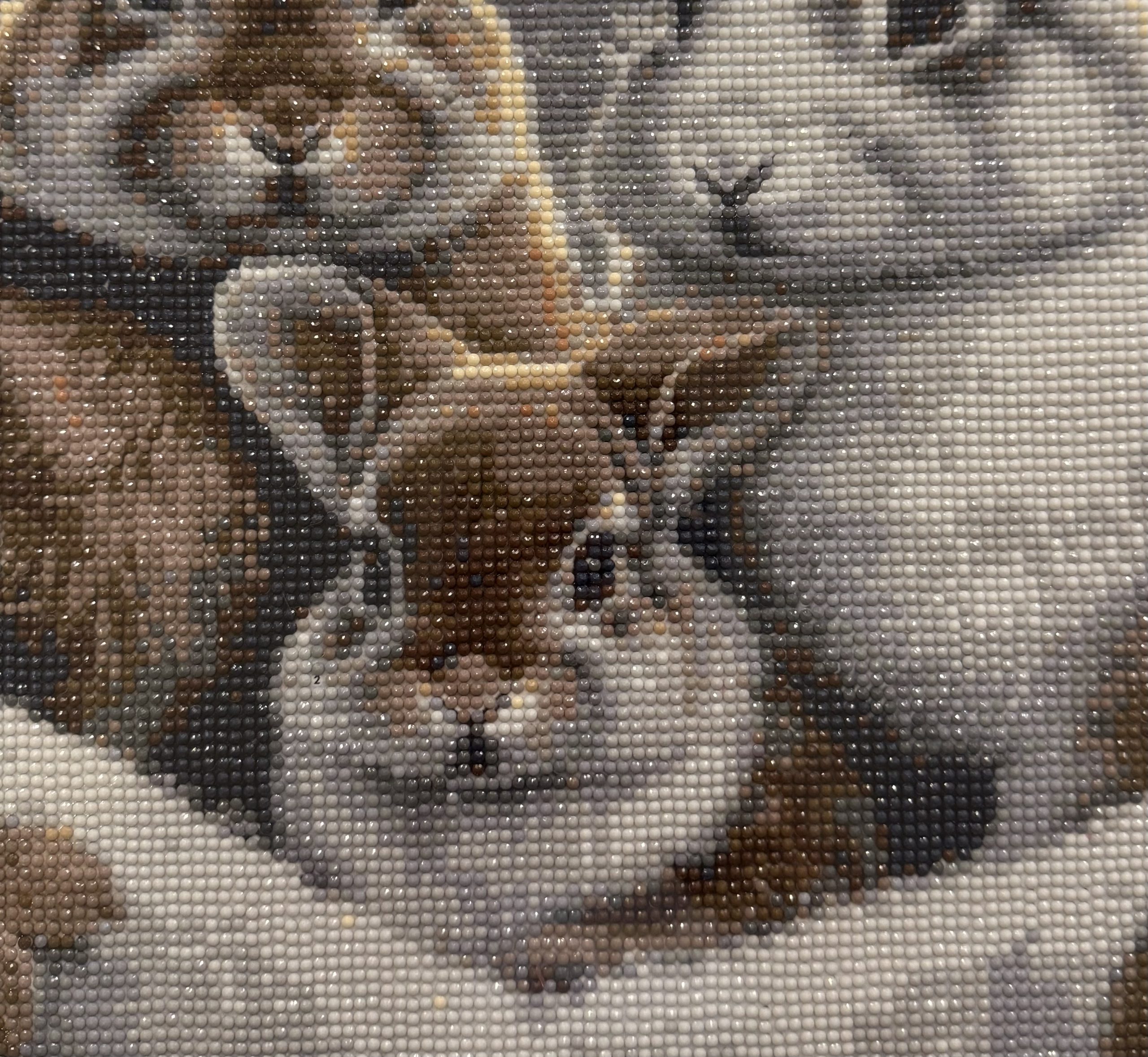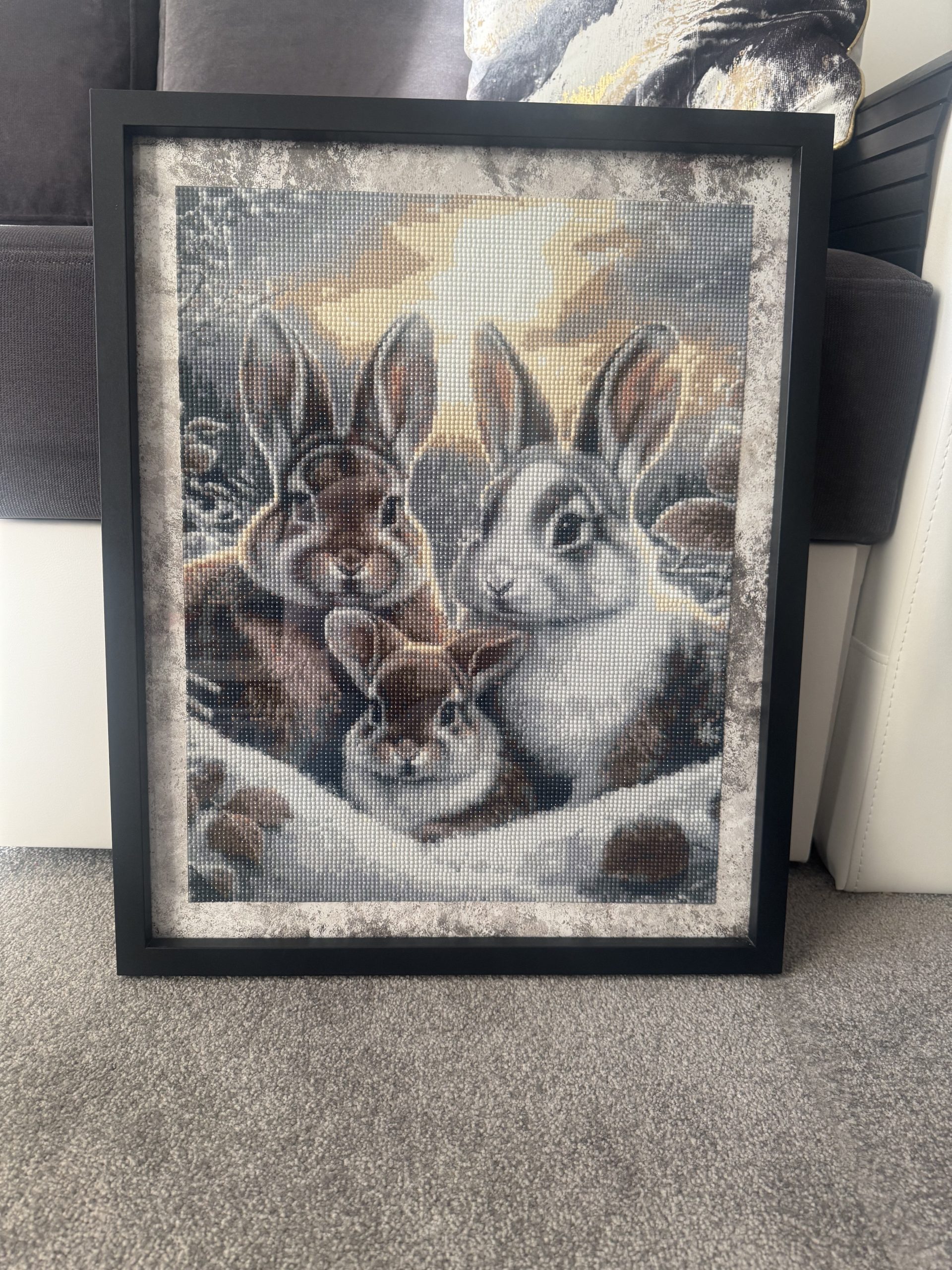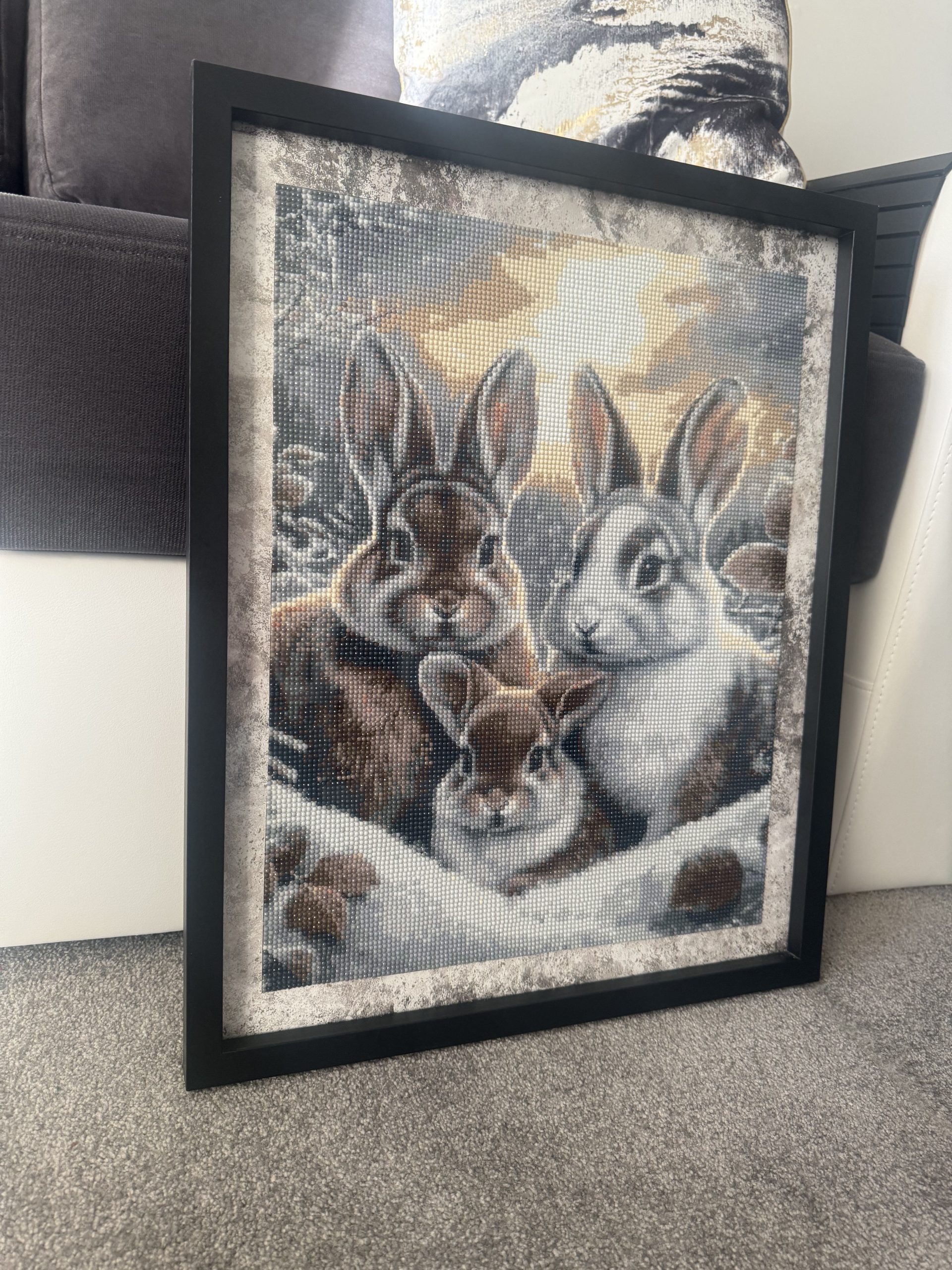Meticulously crafted from thousands of tiny, faceted resin “diamonds,” this artwork possesses a unique and subtle sparkle. As the light changes throughout the day, the picture comes alive with a gentle, shimmering texture that highlights the softness of the rabbits’ fur and the warmth of the background. The detailed shading, achieved through a careful selection of coloured beads, gives the portrait a stunning, almost three-dimensional depth.
