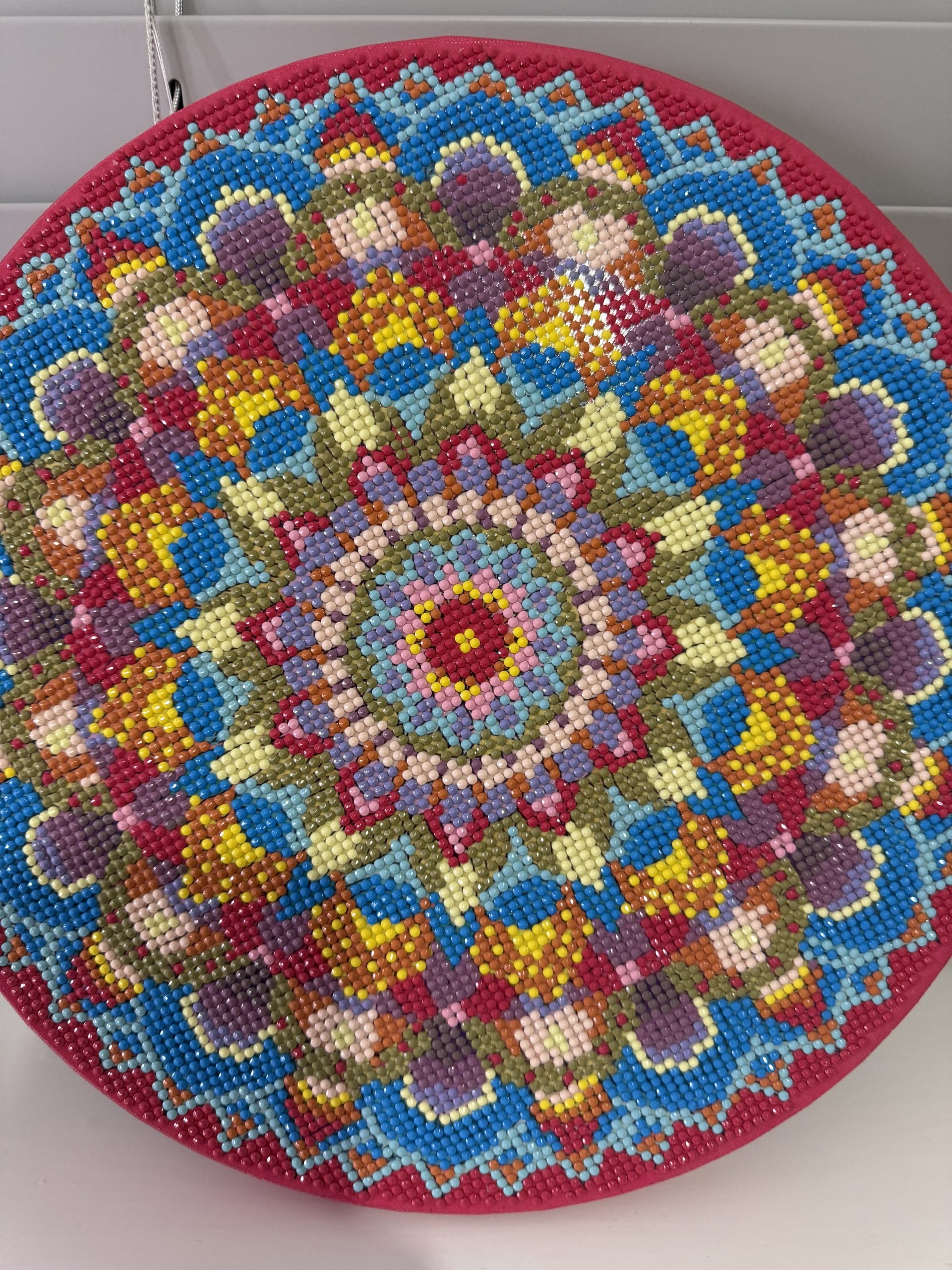Immerse yourself in the mesmerizing beauty of this exquisite handmade mandala, meticulously crafted from thousands of shimmering resin “diamonds.” Each tiny, faceted bead has been carefully placed by hand to create an intricate and harmonious design that bursts with vibrant colour.