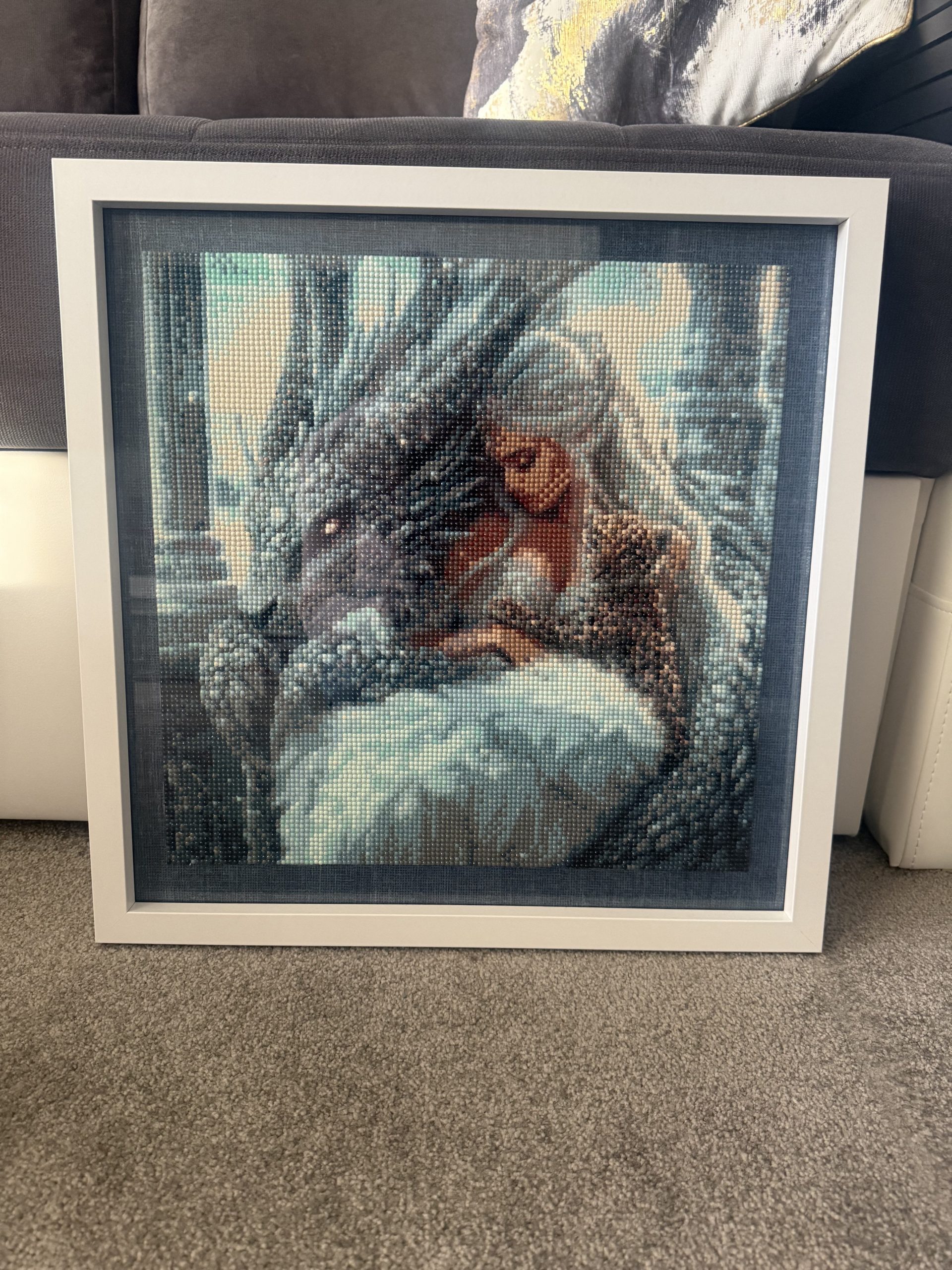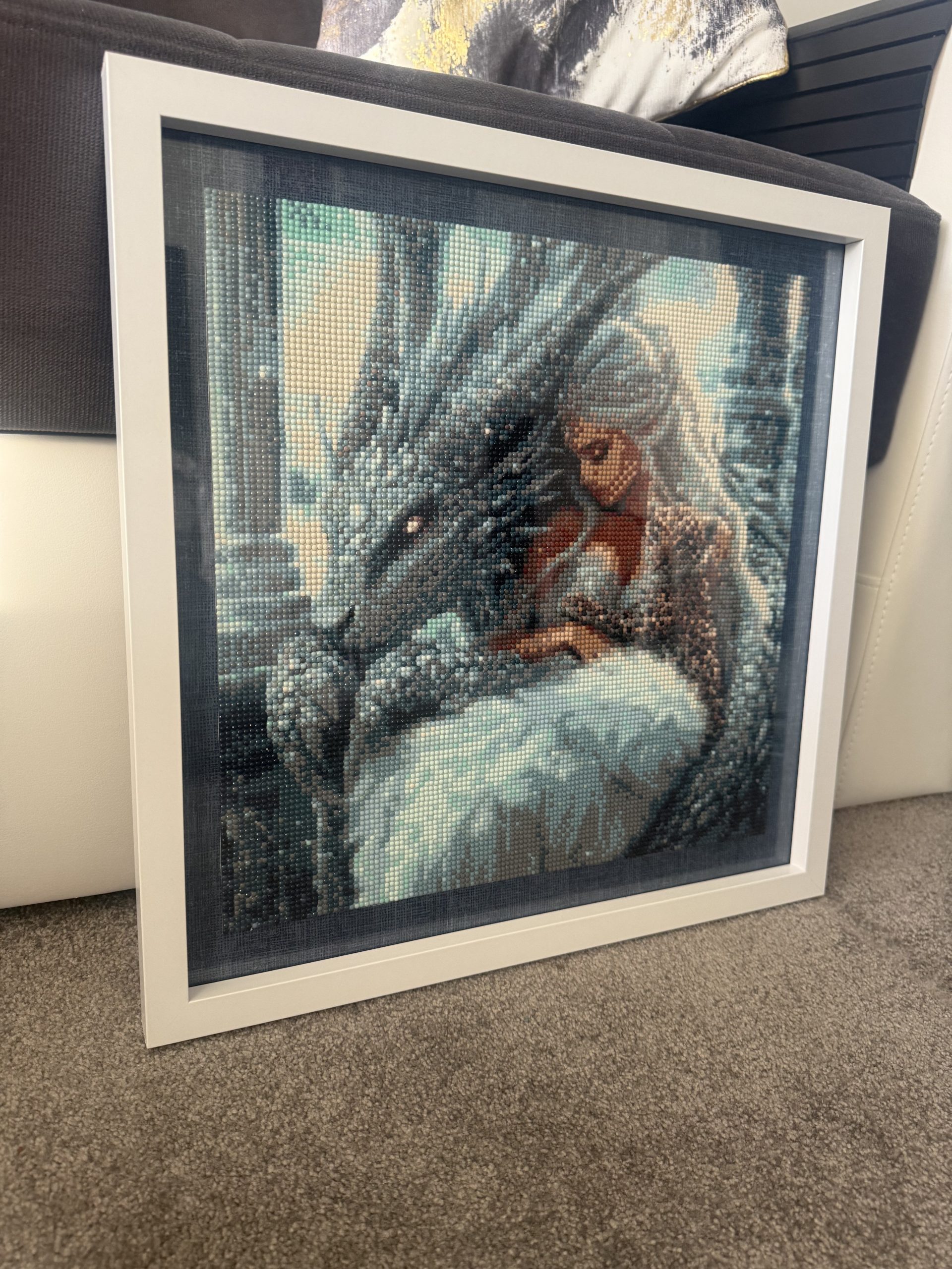 The price reflects the 40×40 cm format, the many hours of precise, hand‑placed resin drills and the quality framing. This handmade diamond painting features a fantasy scene of a woman and a dragon in a magical icy setting. With intricate detail, shimmering texture and emotional depth, it offers a premium decorative finish and a unique artistic statement for any interior. Fully completed and ready to hang.